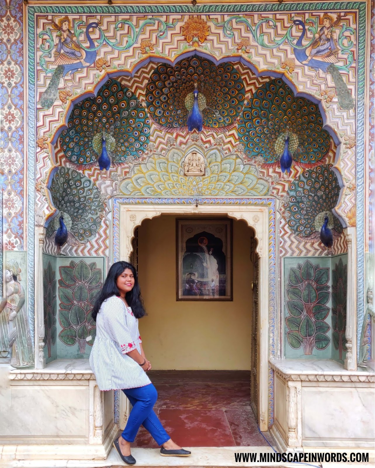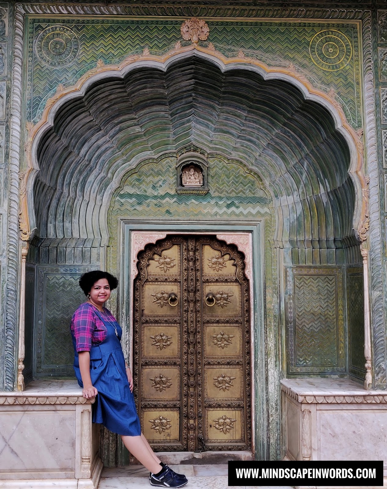 First, we visited the Pritam Niwas Chowk which has the 4 seasonal gates namely The Lotus Gate (Summer), Green/Leheriya Gate (Spring), Rose Gate (Winter) & Peacock Gate (Monsoon.) From the inner courtyard, you can view the Chandra Mahal, where the King of Jaipur resides with his family. I think Suruchi & I spent at least 30-40 minutes at these Gates alone! I was looking forward to get amazing photos here & so I did!