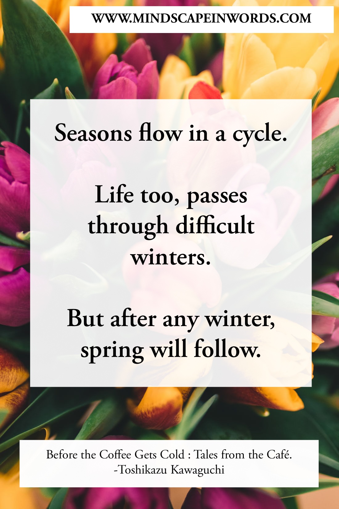 The most lovely message at the end of ‘Before the Coffee Gets Cold’, was that even if someone goes to the past or the future, nothing that they do will change the present. This was the main rule because of which the urban legend had called it pointless time travel. But, what we understand towards the end of the novel is that even if you can’t change the present, you can certainly change how a person feels. Whether it is a person who is traveling through time or the person they are going to meet. Because they decide to go to the past to convey maybe a small message or give a letter or a gift or simply to have a conversation, the only pure thing that changes are their feelings & perspective about life. It was a subtle message throughout the story, but only at the end did I actually understand it & I have loved to ponder over it.