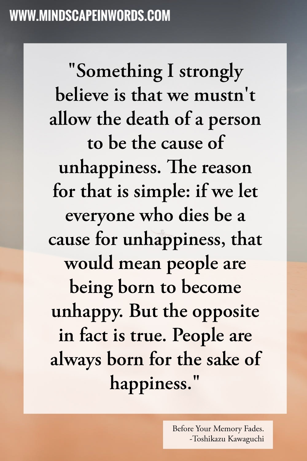 And what I loved the most about the book is how one person can change your whole outlook on life. This one person who means the world to you is no longer alive. And, because they have died, there is nothing to live for, so you want to die too. But, before doing that you want to travel in time to the past to meet your beloved person one last time. But, when you meet them, you are told to not give up on your life and live your to the fullest because that’s what they would want for you.