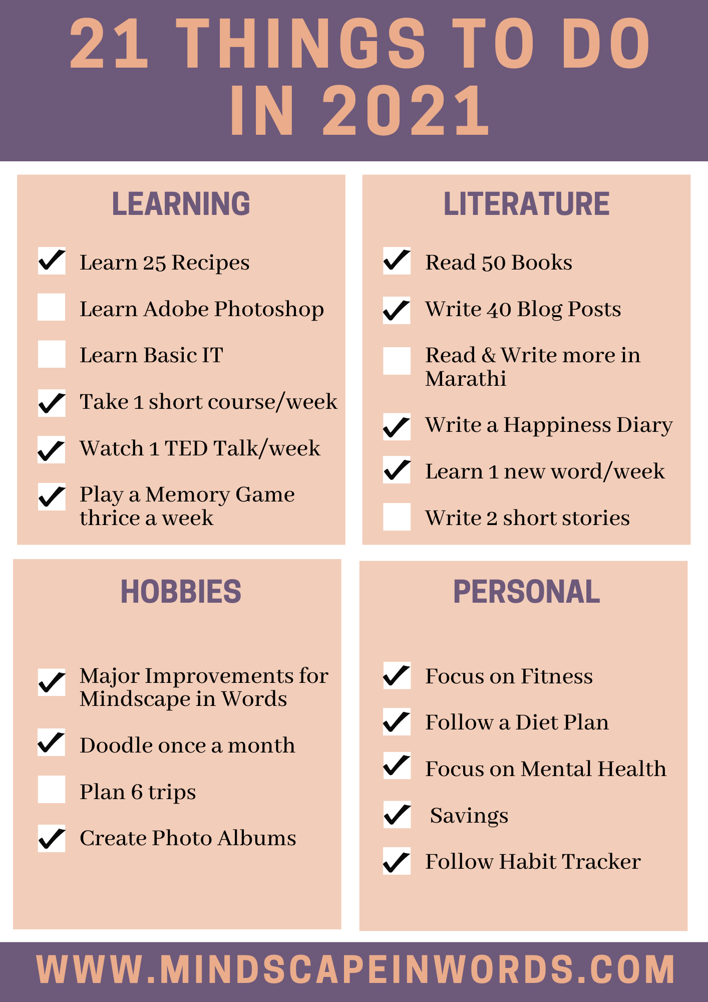 At the beginning of this year, I had set some goals, or my usual 21 Things to do in 2021. Needless to say, that I did not achieve all the 21 things. I did achieve 16 things completely, 2 things partially & 3 things not at all. Below is my updated 2021 goal sheet!