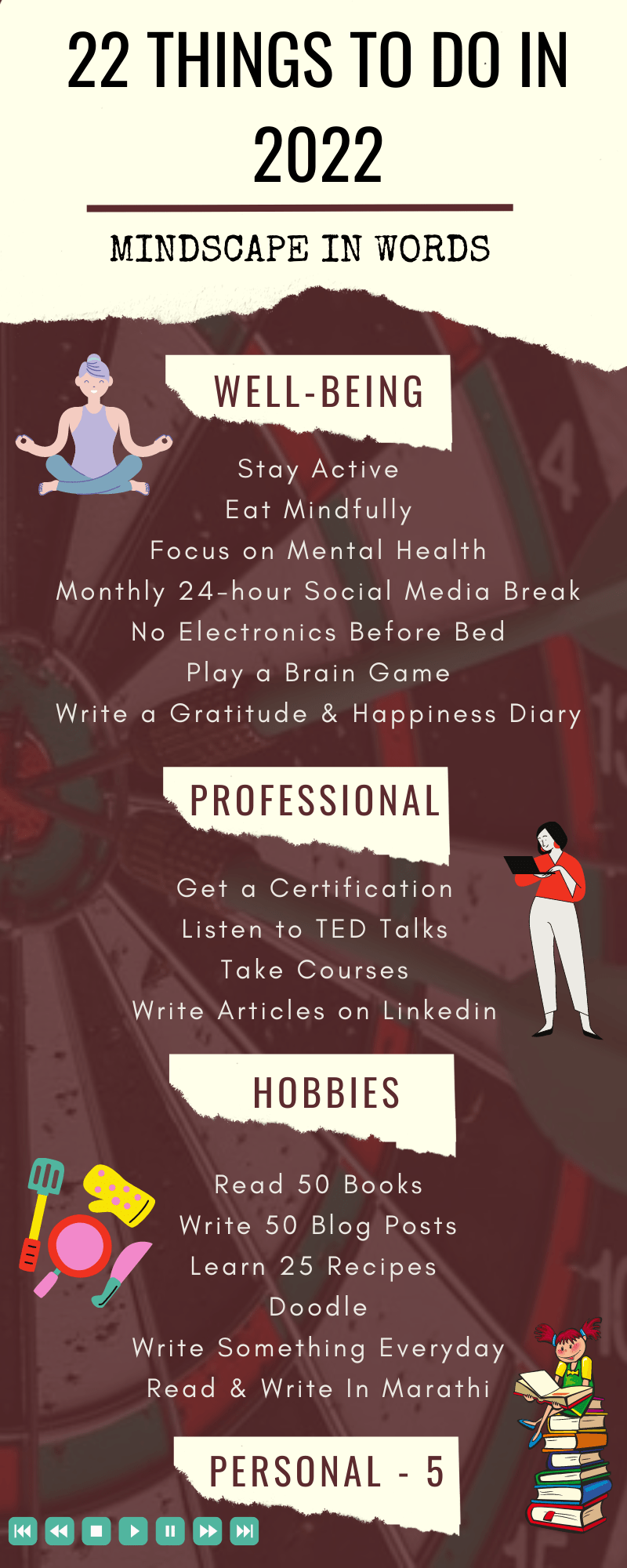 This year I am focusing on a few new things, and continuing on a few old things! My top priority is my own well-being; physical, mental & emotional, but with a little bit less with electronics revolving around every aspect of my life. This itself includes about 7/22 goals. The next 4 goals are work-related. Then 6 goals are about my hobbies, which are the most fun & the ones I will definitely achieve, no matter what. And the last 5 goals are personal, which I will keep to myself.