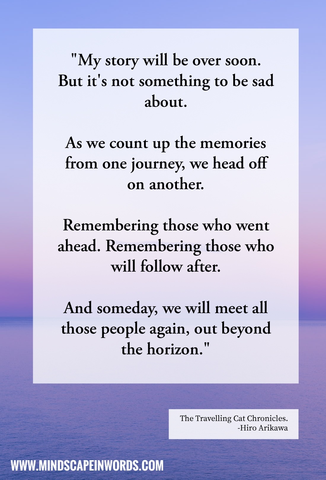 All the cherished stories of friendship, love, belonging are pure in entirety. All the memorable trips with Satoru & Nana in the silver van feel like you are with them sitting in the back seat feeling all that those two are feeling. I truly enjoyed the beauty of countryside with its horses & sea of grass & unexpected sight of double rainbows. I was lost in their world & they made me feel welcome to experience all those things, but also all the emotions beyond those things too. I loved being on this bitter-sweet journey of stimulating yet funny conversations, frightening yet hopeful destinations, new yet familiar friendships & a riveting thought-provoking presence, all in 238 pages! I have rated The Travelling Cat Chronicles at 4/5 stars!
