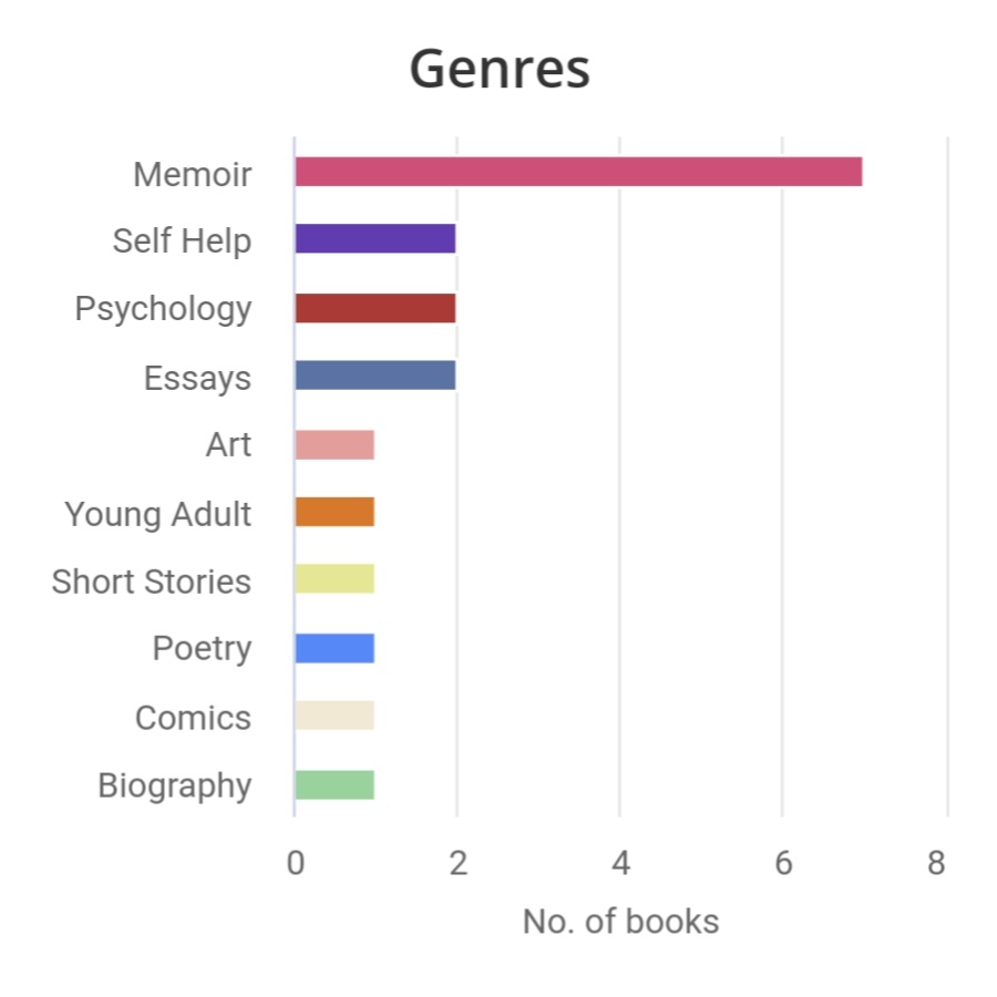 Usually, I am never able to stick to it, so this time it’s even more celebratory! I would have loved to see a diverse mix of books in the nonfictions, but most of them are memoirs. Nevertheless, celebratory! Check them out and you may find your next favourite read in them!