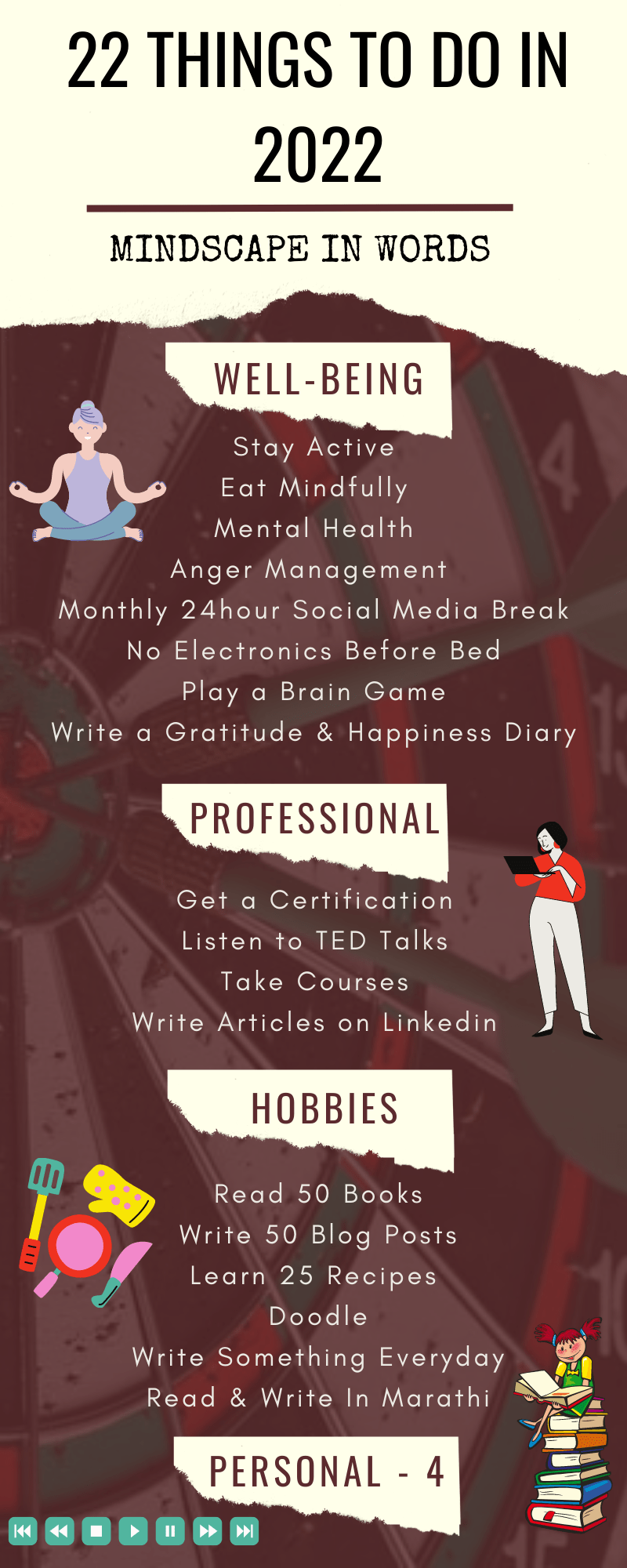 I had eight things to do under well-being. I somehow managed to do five of them. Not completely. But just with immaculate imperfection with no consistency to it at all. But I did do them for longer than six months, which is why I am ticking them off. From this lot, I am going to carry forward almost all of these goals to next year as well.