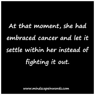 She had cancer. This news hit her harder than a truck. At least getting hit by a truck meant instant death. But this? Cancer? It was prolonged death. She sat on her bed thinking about the past. The fear of dying does this to people. Your entire life flashes before you. She remembered her childhood, college, marriage and kids. She was 61 but she felt much older. She had an inoperable disease and this scared her. Doctors had given her a life statement of 2 to 3 weeks. She found it utterly obnoxious how the world works. She was away from smoking and drinking. She knew these things would kill her sooner. But, now it all seemed like a big joke. She never took risks with people for the fear of losing them. But now, she was a single widow staying alone in an apartment making her own living. Somehow she lost herself in the process. The chemotherapy sessions sounded like giving away parts of her soul, one at a time. She couldn’t hold it in her. Instead of crying, she exploded in a roar of laughter. She was going to die! The woman who did everything perfectly, never disrespected anyone, never went the wrong way, lived on ideal beliefs, has now gotten cancer! How often does that happen? At that moment, she had embraced cancer and let it settle within her instead of fighting it out. She had given up a battle she knew she’d lose. She could’ve given up fighting. But, she just settled, like she did all of her life.
