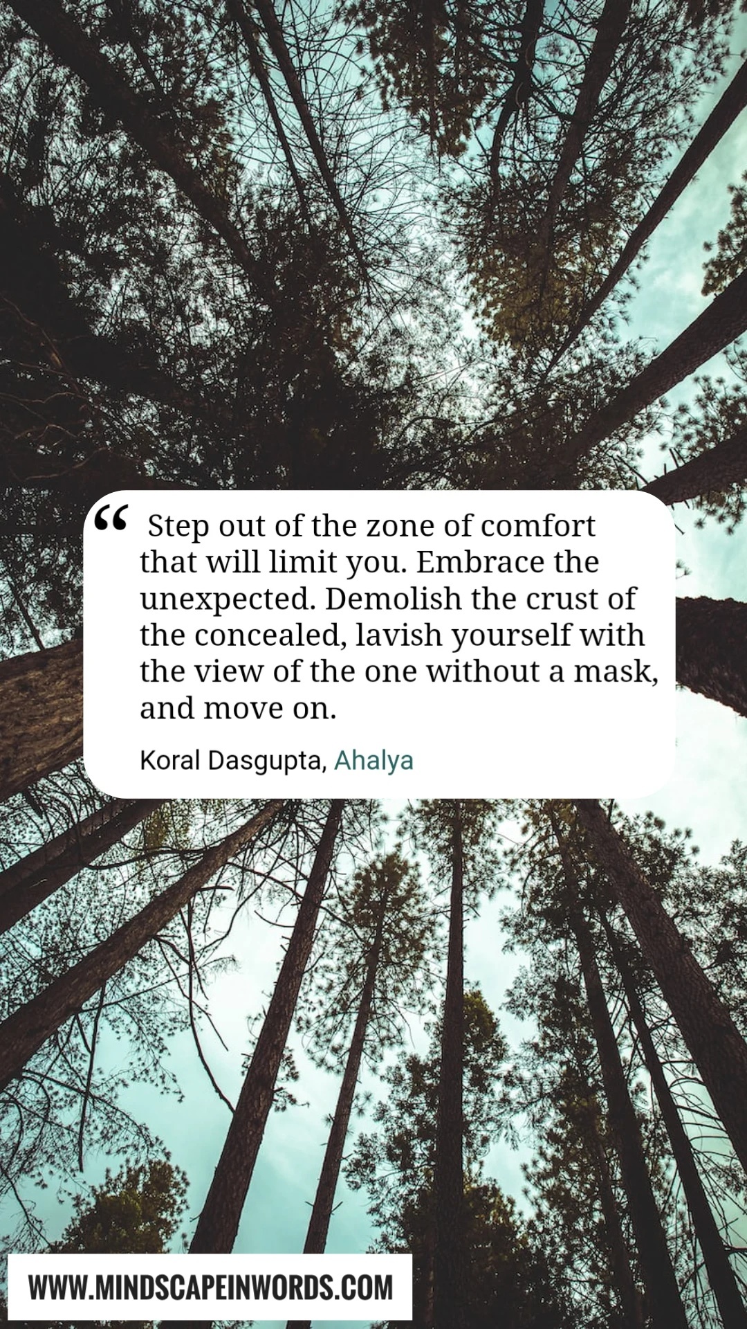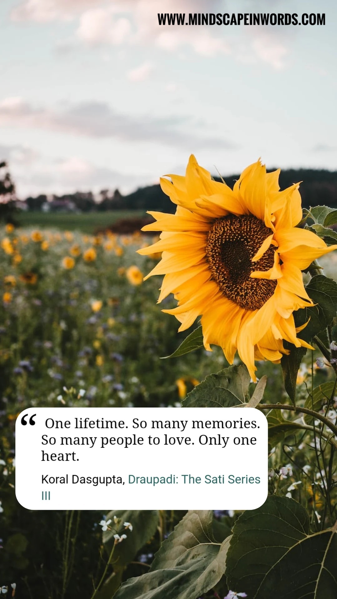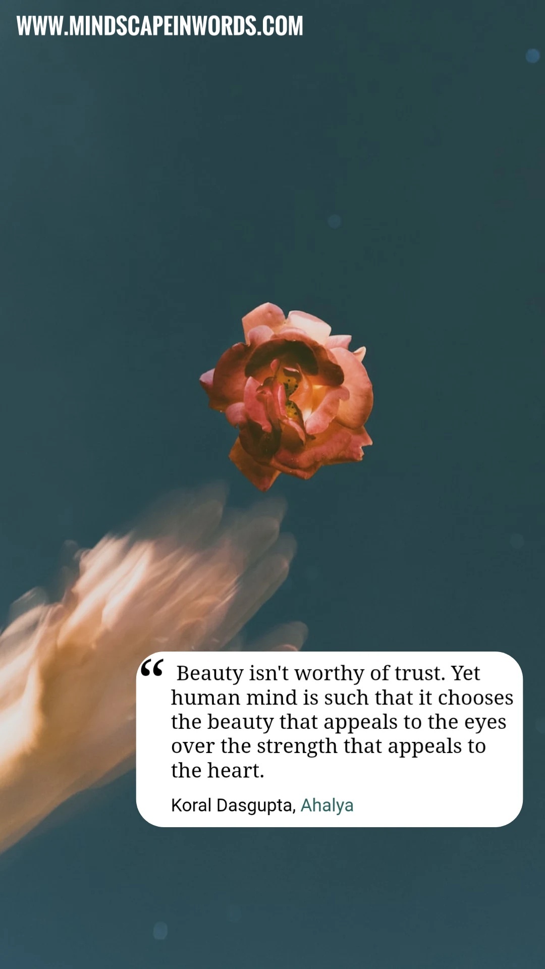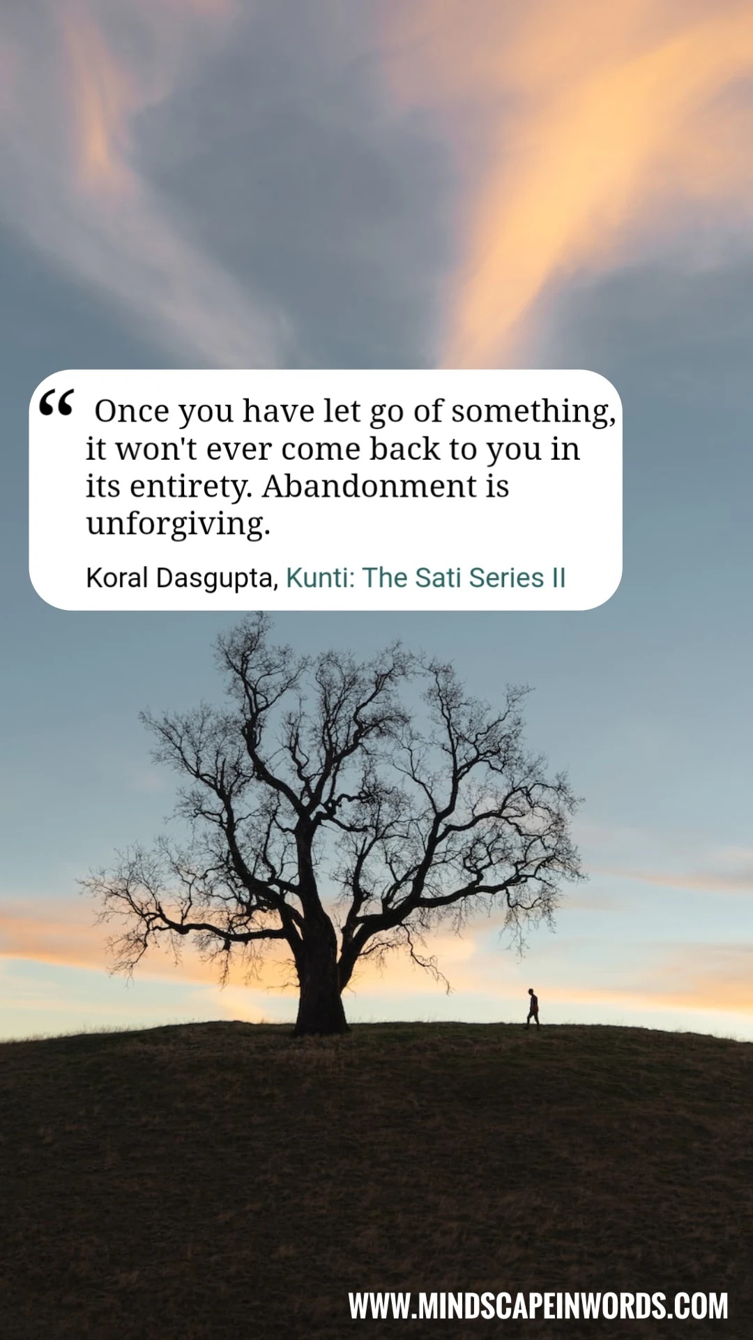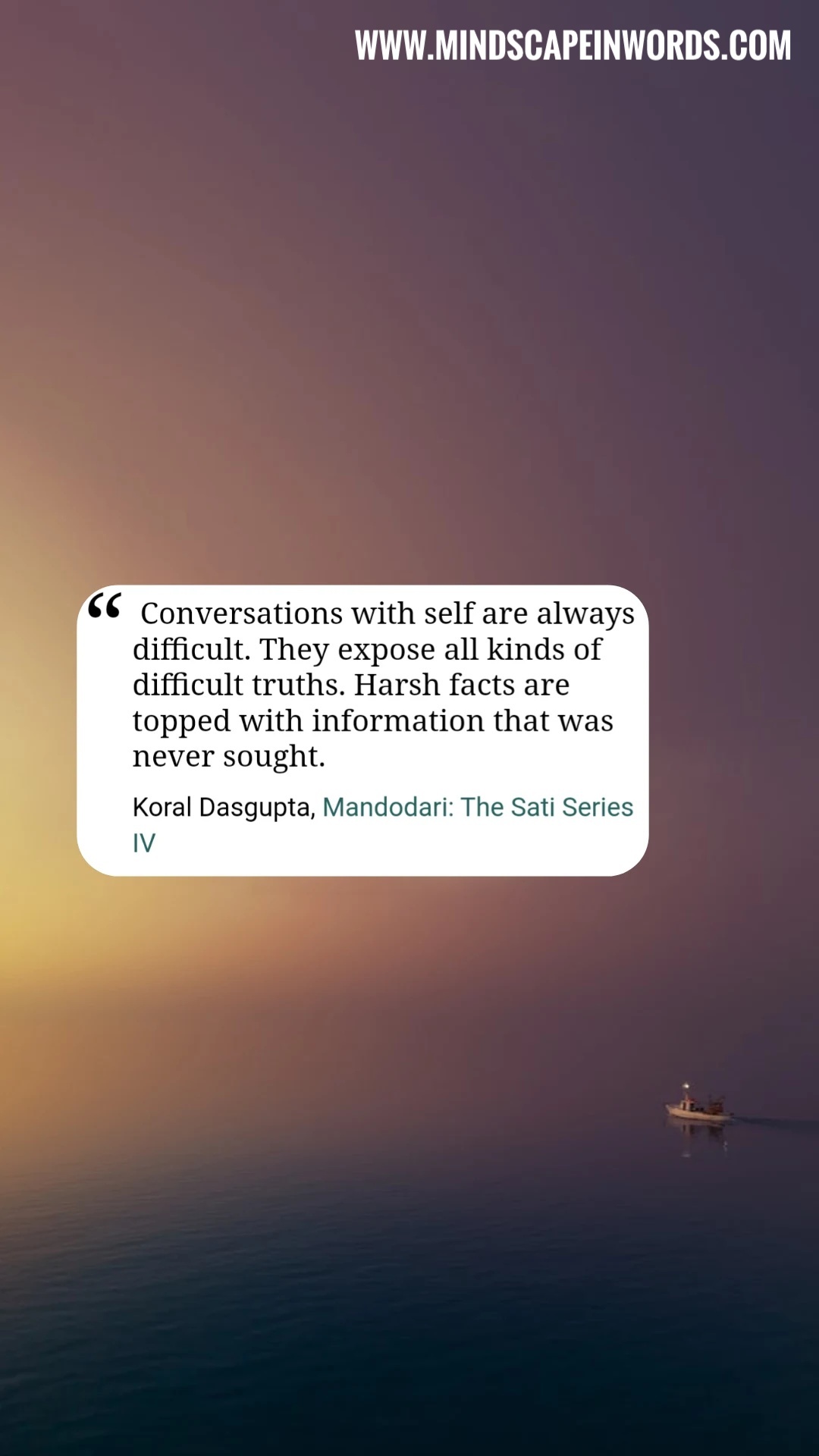 “She called it ‘Sati’. A pursuit to remain loyal and committed to one’s truth and never deflect by greed or guile. To own up with conviction and turn away from deceit. To recognize the voice of the self without pretence and resist being touched by alien assassins inducing cynicism. To express with dignity, to comprehend in totality. To love without reservations. To give and not be affected by the pride of giving. To know, to value, to rise, to shine. To find the joy of life in little nothings. To identify beauty in the mundane.”