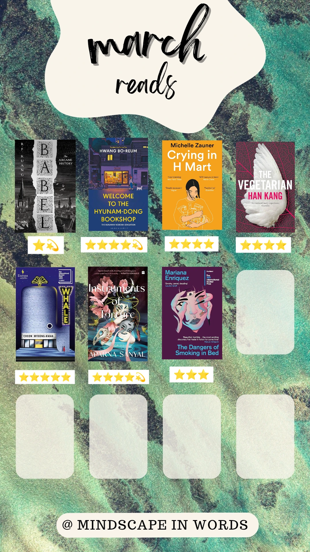 March was long and I, for one, was glad for it. Aside from the one audiobook, I read the other six books from my physical TBR. As March is Women’s History Month, all the books I read were written and translated by women. March is also the month where a lot of readers read Korean books, so for Korean March, I read 4 books translated from Korean.