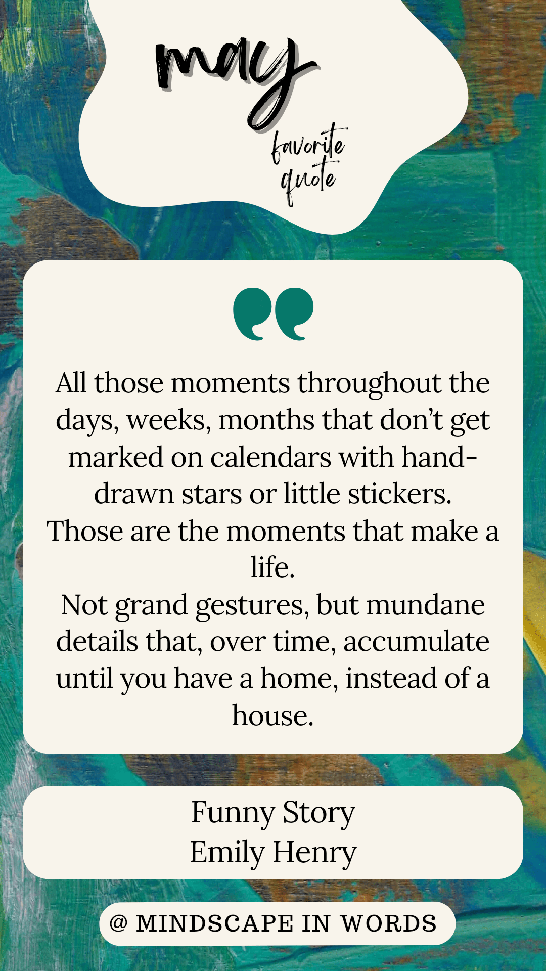 After 4 books of disappointment, I finally liked Emily Henry’s fifth book, Funny Story! Funny Story worked for me for a lot of reasons. Most importantly, it did not have all the flaws that the first four books had. No annoying characters. No cliché stories. Predictable yet not cringey. Hot romance. And most importantly, it wasn’t just a romantic novel. It was about glorifying healthy relationships. I think in retrospect, I have more affection for the book because I can appreciate the entire finished puzzle better rather than just looking at single pieces.