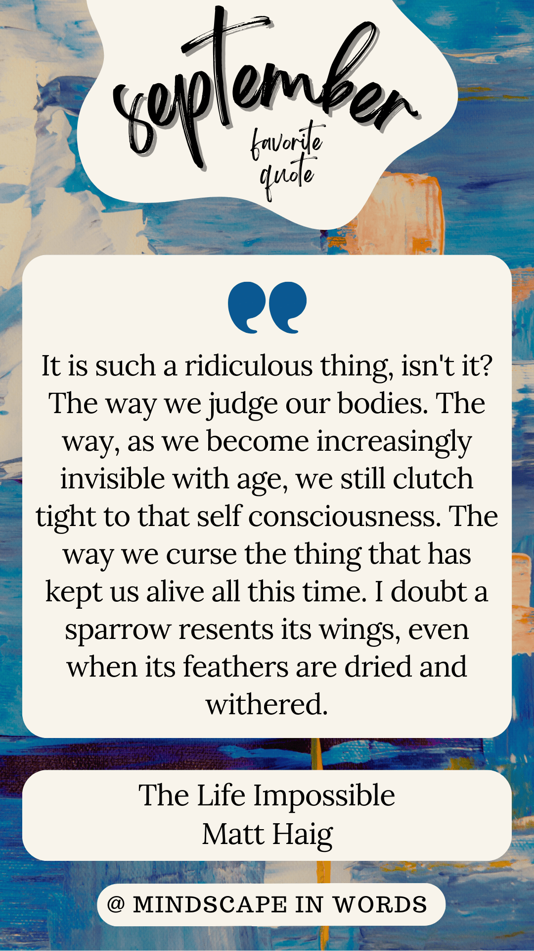 The Life Impossible is the story where 72-year-old Grace Winters makes an unpredictable move to Ibiza, where her old friend Christina had left her a bungalow after her death. When Grace lands in Ibiza she tries to uncover the mystery of Christina’s death. This leads to meeting new people, exploring new places, doing things she never imagined she’d do. And at the centre of it all is magical realism. The plot was quite straightforward with a lovable but flawed septuagenarian woman going to a different country, uncovering the cause of her long-lost friend’s death, finding the culprits and all to preserve the ecology of the precious place in Ibiza. I absolutely loved this book and want to read everything that Matt Haig has written. I rated The Life Impossible by Matt Haig at 4/5 stars!