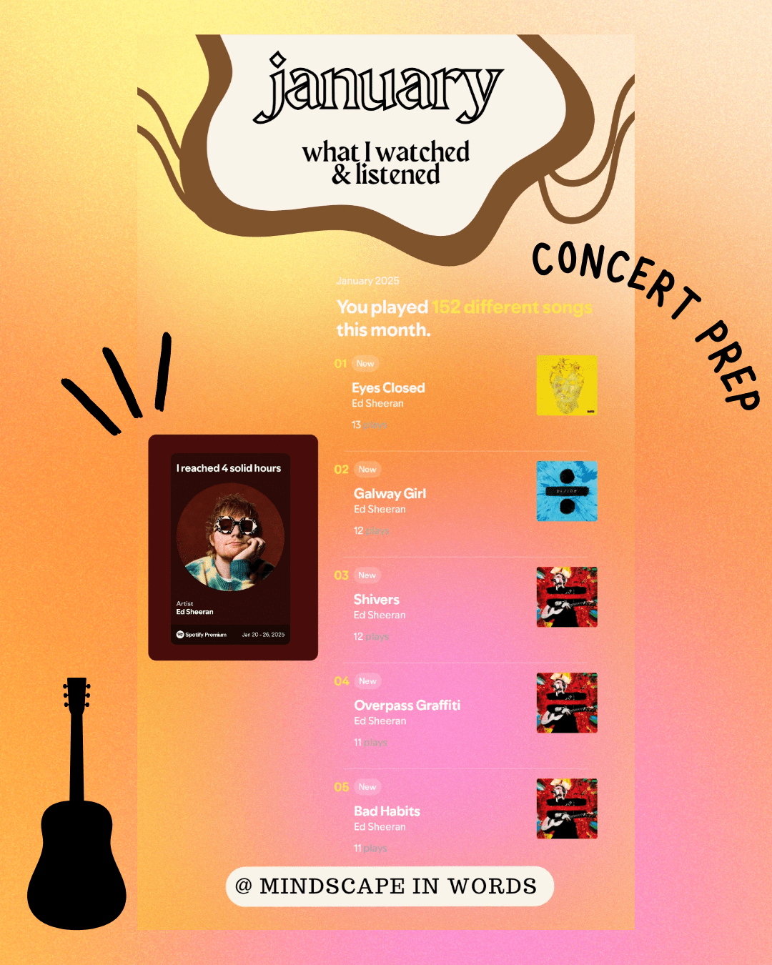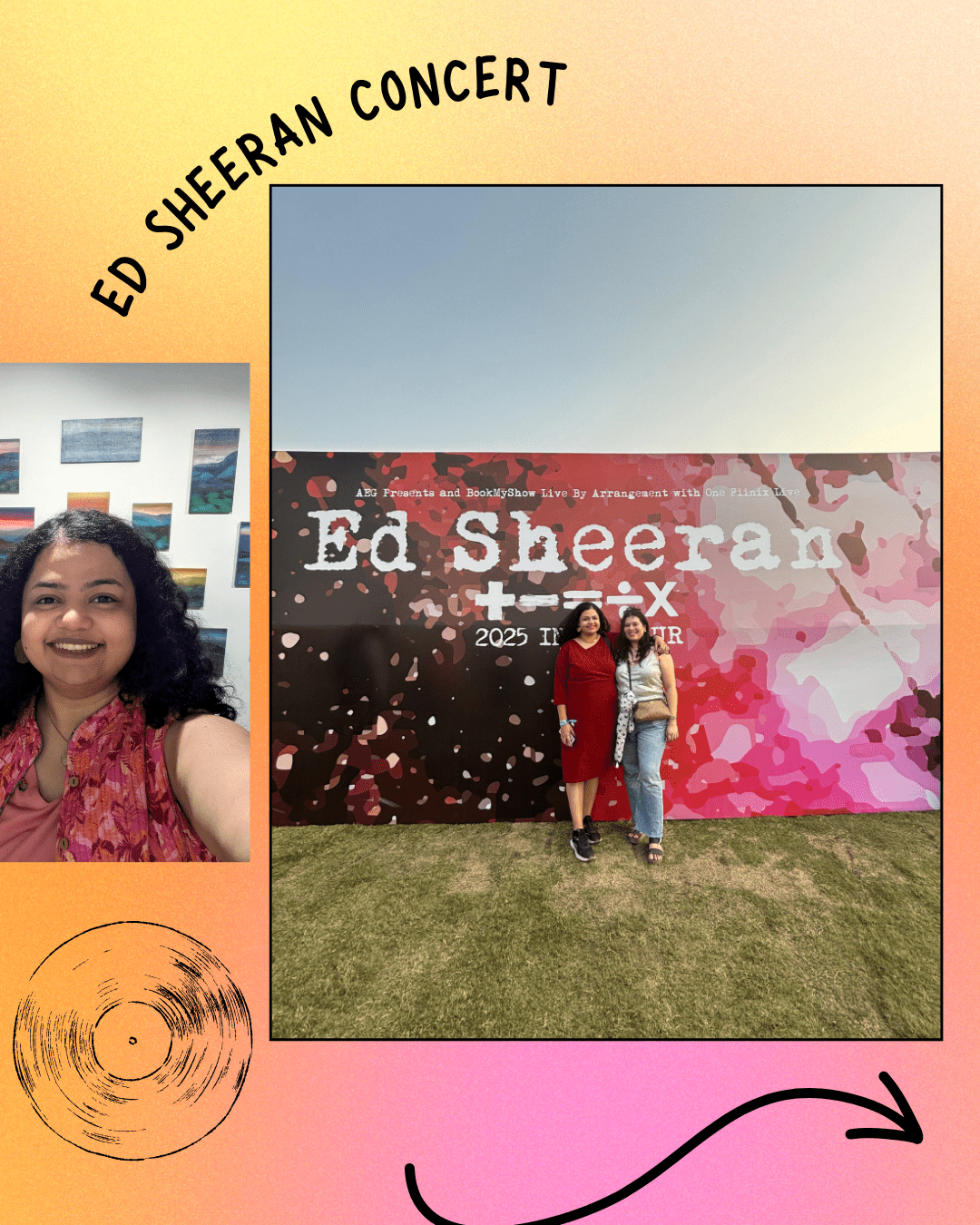 Slide 7 to 10: Highlight of the Month was Ed Sheeran’s concert in Pune!!! Suruchi and I went to his first ever concert in India back in 2015. And now, 10 years later, we went to see him live again! It was the most amazing experience. I have a very weird connection with the musicians I love. I listen to them every day, I know all their songs and lyrics, their families and see photos whenever they hangout somewhere. It’s like they are a part of my life, like they are my long-distance friends. So when I saw Ed singing in front of the crowd it felt just like meeting an old friend. Because I listen to them so often, I just take it for granted, but when I saw him live, I was once again thrown off by how immensely talented he is! The kind of show he puts on for his fans; the loop pedal technique or his raps or how he engages the audience.. it’s all just perfect.