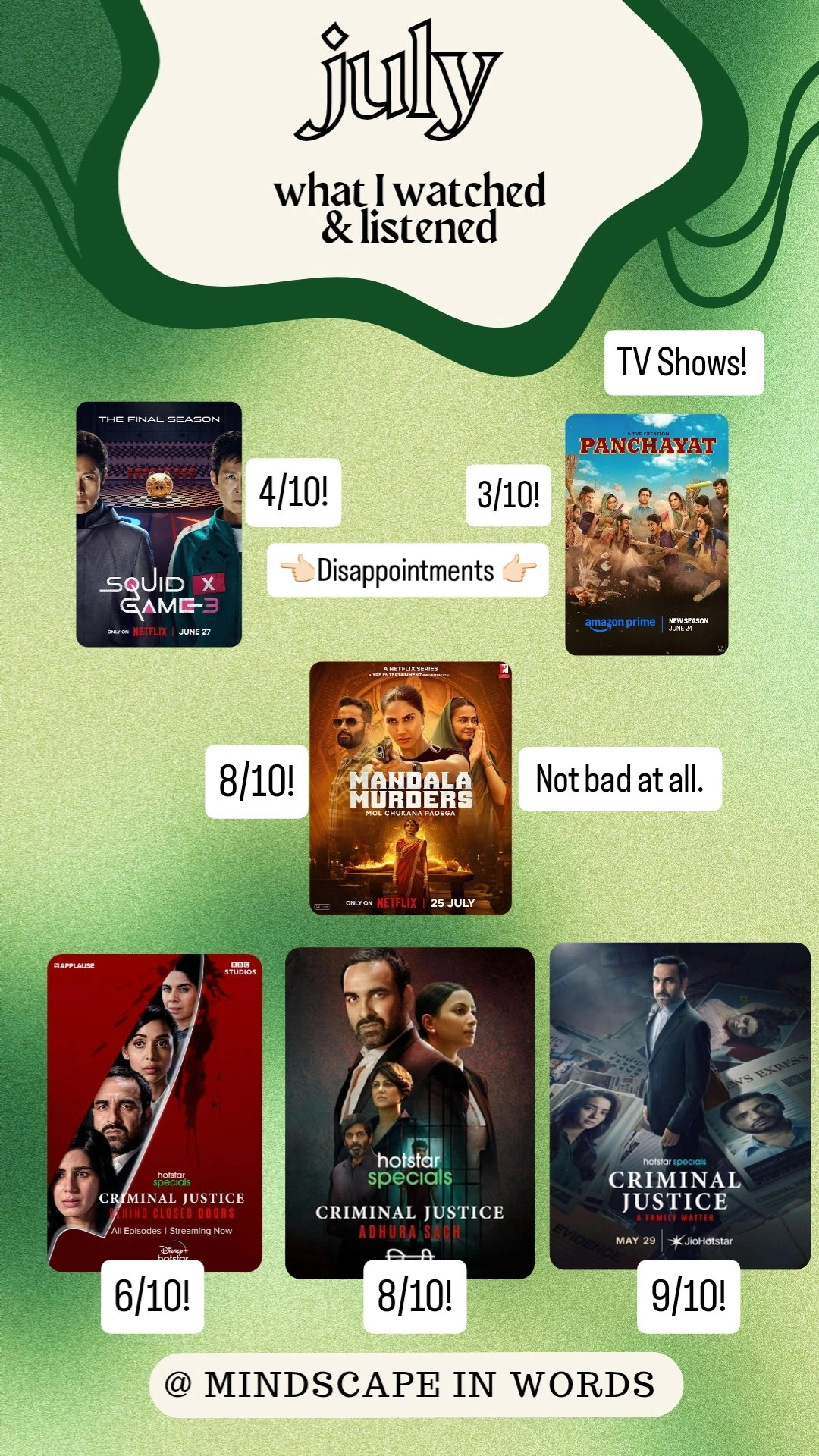Hi Readers! July was GLORIOUS! The major reason for this was obviously Goa vacation. And, in addition, I was able to embrace the rains rather than being constantly worried if it will rain when I’m enroute office. And yes, office life has been hectic per usual. But, one amazing thing happened. I was supposed to conduct a virtual learning session for 140+ people. Every time I have done this before, I followed a script and made my tone to make it as impromptu as possible. But, I don’t know what took me over this time. My presentation was not made until the day before. Somehow I have convinced myself that I was done with scripts. So, I went with the flow! NO jitters like before. NO imposter syndrome. NO backouts. It was an invincible feeling, and I truly hope it happens every time I have to conduct these sessions, whether virtually or in person. Okay, I didn’t mean to rant starting off, but here we are. Let’s look at the rest of the month!