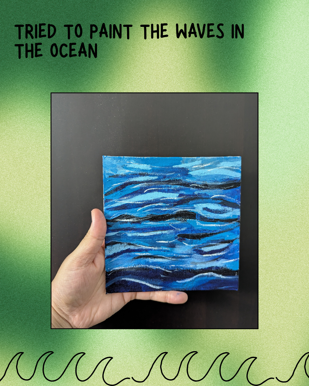 Slide 16: I refuse to ‘practice’ painting and hope for a masterpiece and every time I am humbled. LOL. But, even though far from perfect, I like this ocean waves painting. The favourite kind of blues.