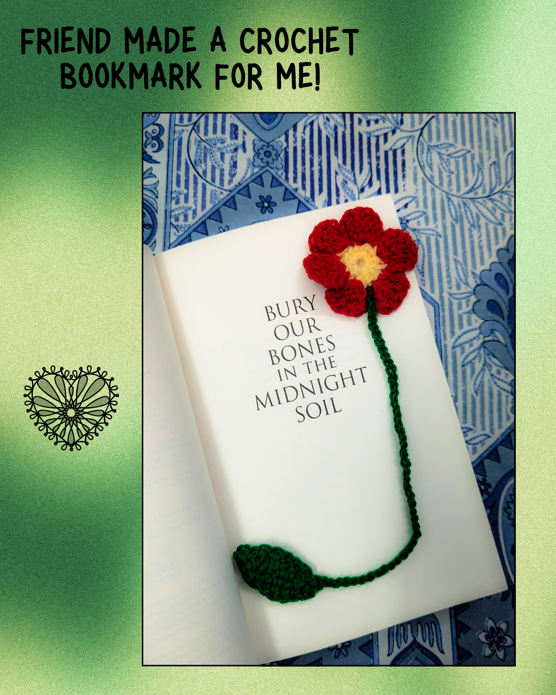 Slide 17: Two of my friends at work have gotten very seriously into crafts. Genevieve is into origami & a heart shaped bookmark is waiting for me from her! And, Suchi is into crochet. She made this GORGEOUS bookmark for me. I mean, puppy dog eyes!
