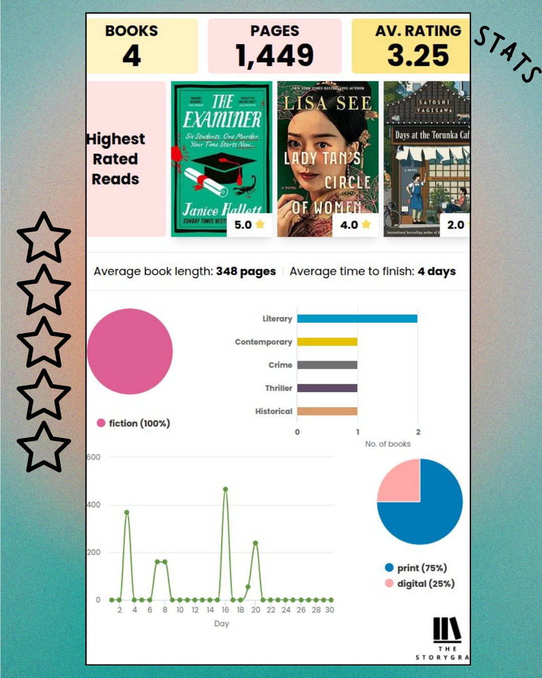 Of the four books, three books were paperbacks that I owned. I had the copies of Lisa Tan & The Examiner for a long time, so I’m happy I finally got around to reading them. The love-hate ratio was about 50-50 this month, but somehow even the books I didn’t like, I enjoyed on occasion.