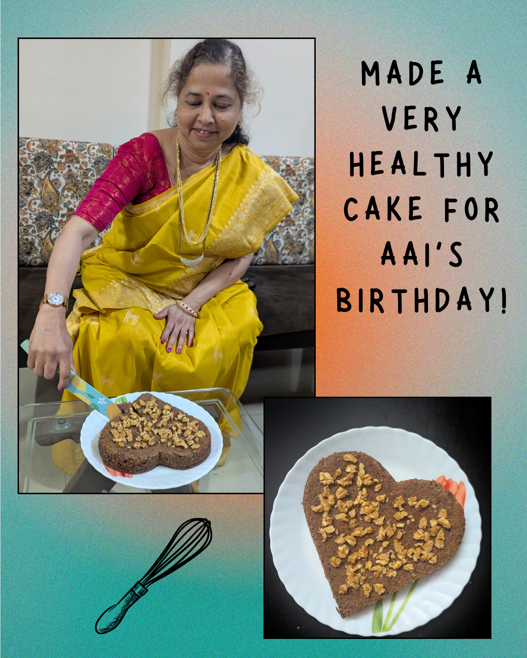 Slide 2: It was Aai’s birthday this month. On the day, she had to attend two family functions so she got to dress up in two pretty sarees. Since working out is slow, diet has taken front seat. So, I made a no-maida, no-sugar high protein date and walnut cake. It was delicious, and we didn’t even feel like it was a guilt-free cake so it was even more delicious. LOL.