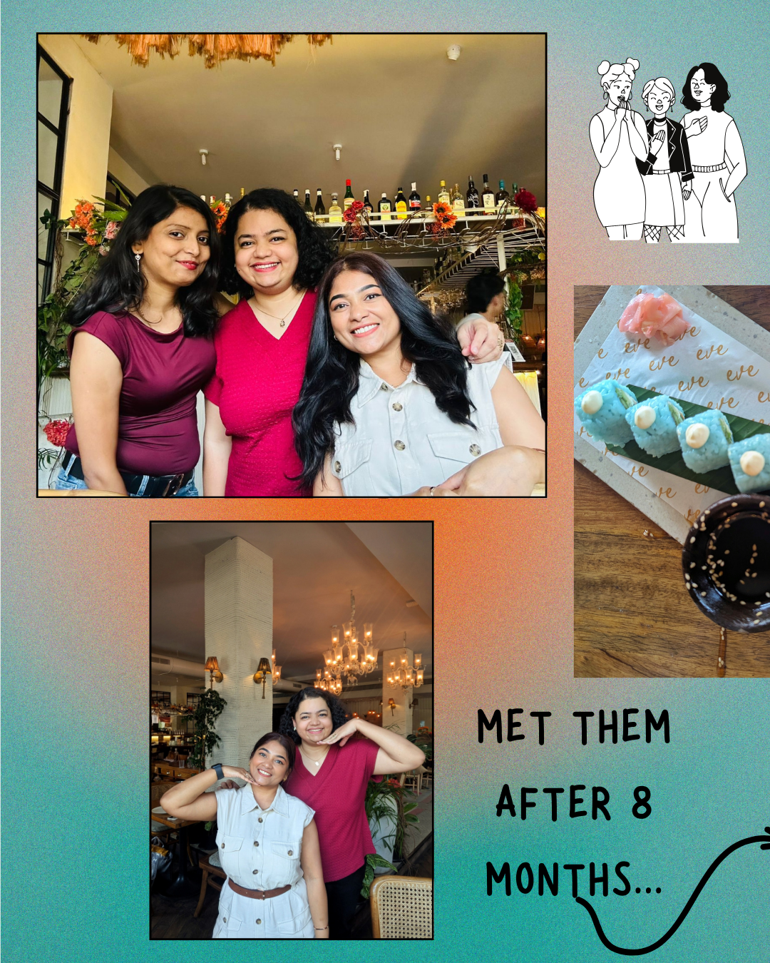 Slide 3 & 4: PAM reunion!! That’s Poonam, Aish & Mindy. It might be cringe, but we have owned it for a lot of years now. We had very little time together. Especially since we met after so long, it felt even more tiny. But, we had the best food at Eve in Powai and the most fun time together. <3