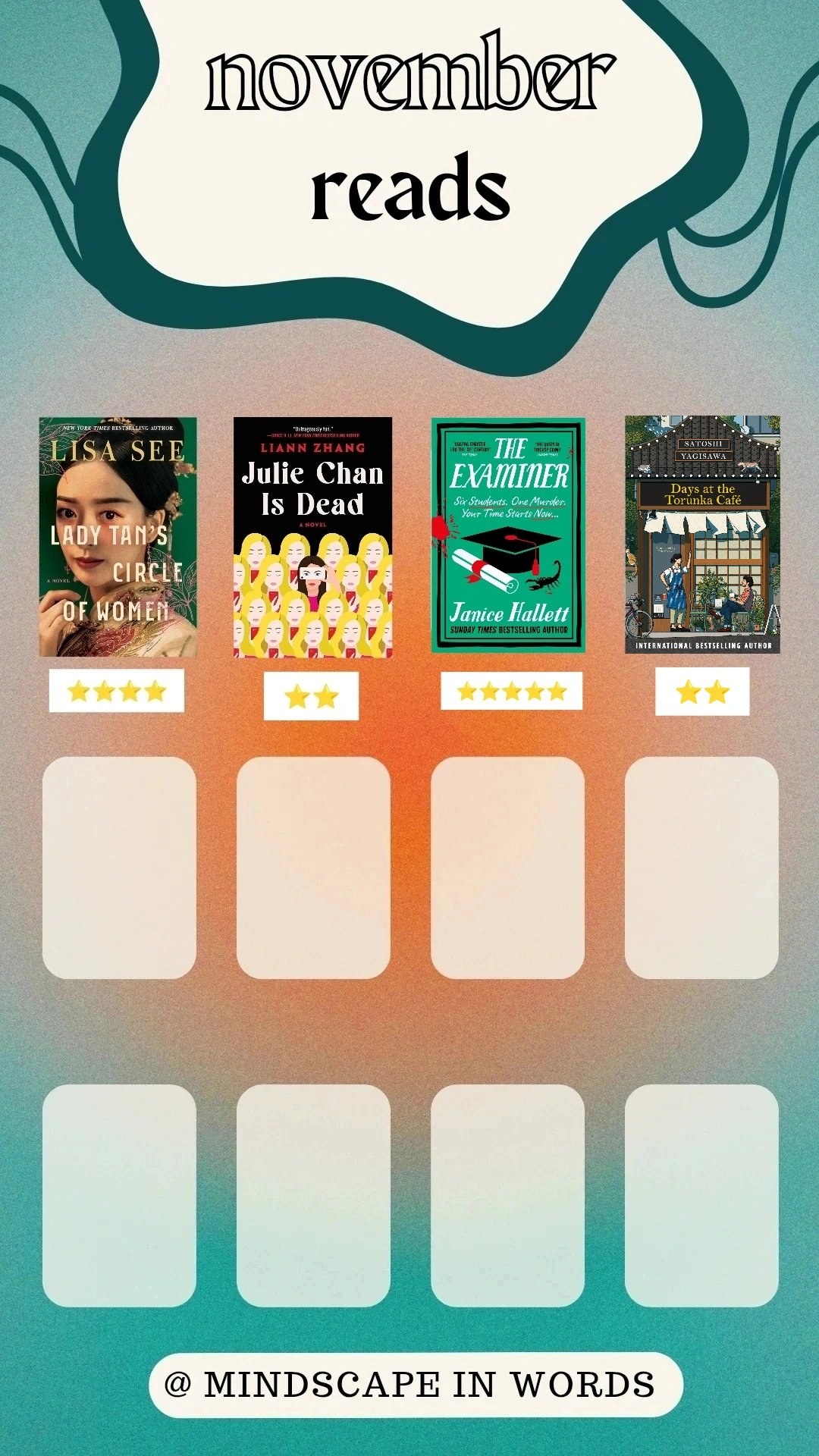 I read FOUR BOOKS across 1449 PAGES in November! I loved two books and did not love two books. Check out my reviews to see if you would want to pick any of them.