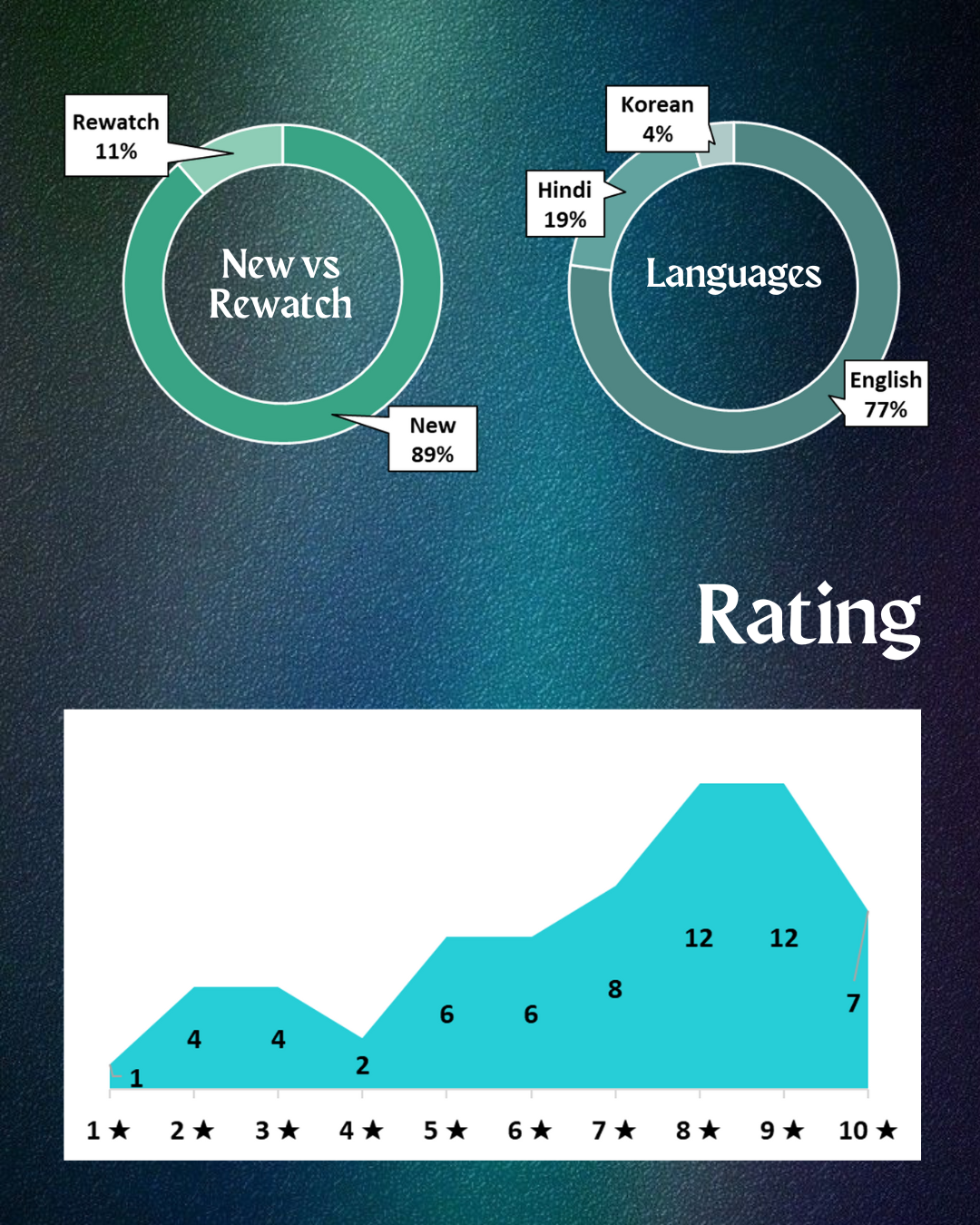 I loved watching classics such as Inglorious Basterds, The Truman Show & Misery, which I have no idea how I hadn’t watched before! From the award-winning movies, I enjoyed Sinners, Frankenstein & Bugonia. An unexpected movie which popped in my top 14 was The Life List. It was a very simple movie, average story, average actors, but there were too many little things in it which struck a chord, so I ended up loving it! Some special mentions would be Chhava, Anandi Gopal, Mrs. & A Real Pain. Two movies which were insanely hilarious were The Roses & Wicked Little Letters, both starring Olivia Colman, probably why they became so hilarious in the first place!