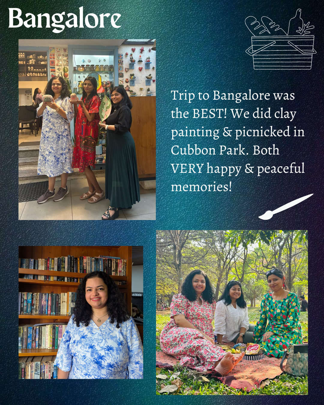 In March, Poonam and I went to Bangalore to stay over at Mrinalini’s home. We had such a lovely time together, as we always do! The highlight of this trip was when we went for clay painting. I found it very relaxing, calming and a perfect way to turn off my overthinking brain. Another day, we packed a basket and had a picnic in Cubbon Park. Doing this made me realize we should be doing something like this way more often!
