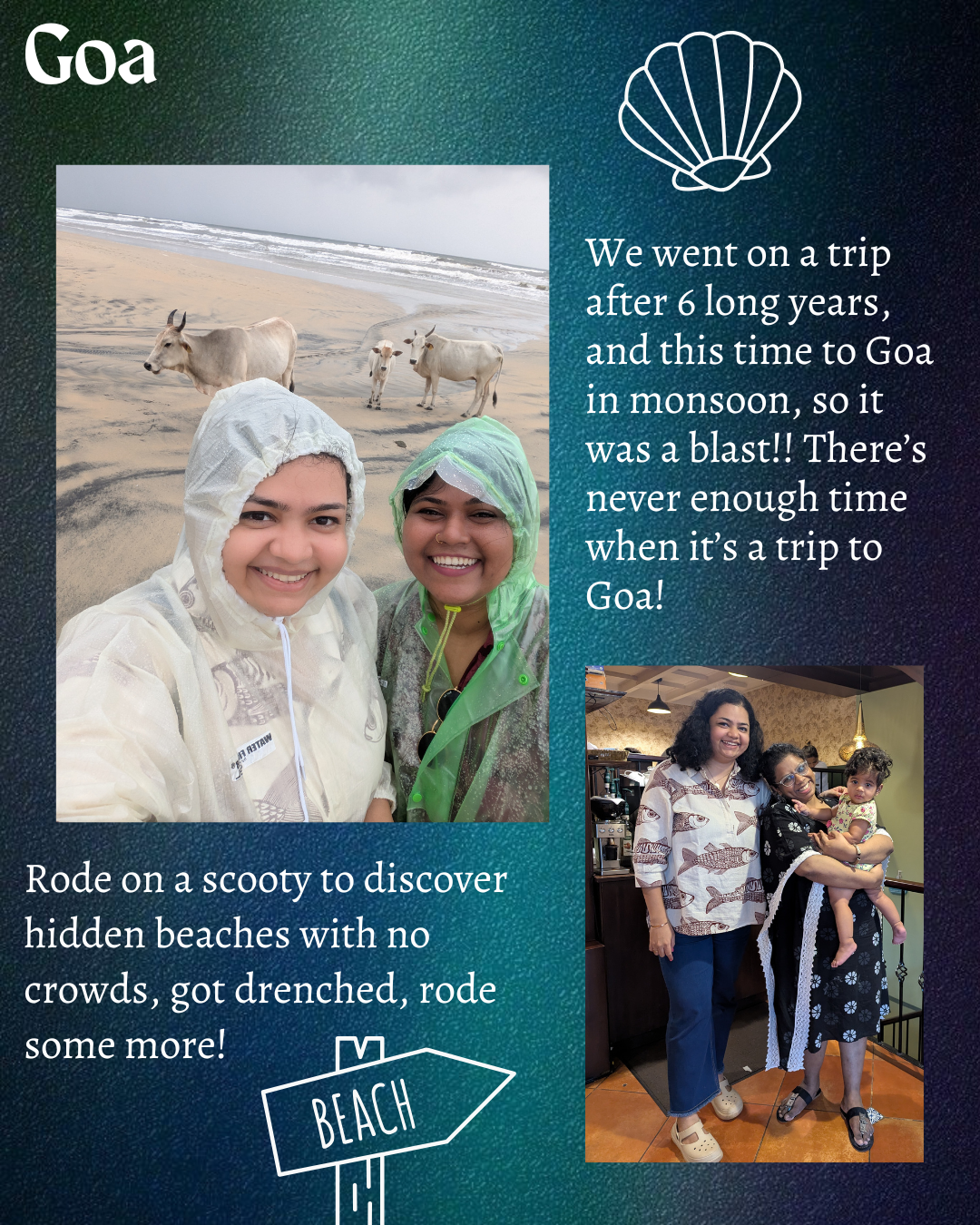 In July, Suruchi and I went to Goa. This was an impromptu trip because none of our other plans were working out and we both really needed a break from work. This was mad fun as it was monsoon season. The best part was the day we drove around on a scooty all day!