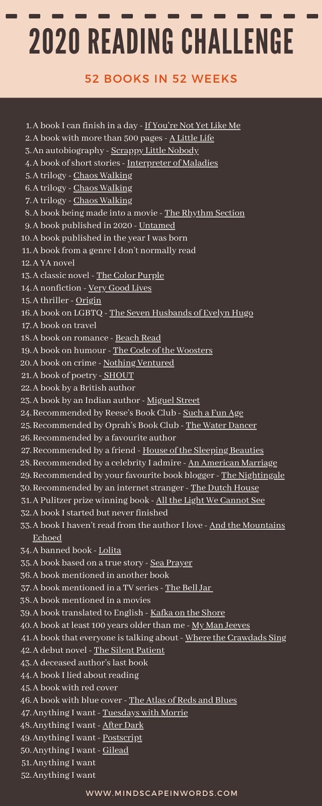 Hi Readers! Now that we are more than halfway done with 2020, I thought of updating you guys with my Reading Challenge. Here is the main first post if you want to download the image! As you know I had prepared a challenge of reading 52 Books in 52 Weeks& I had also decided on the 52 categories to make it more fun! I have updated the same image so you can check out the books I read so far. I have already read 48/52 books this year leaving a lot of scope to read a lot more.